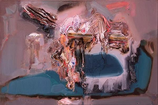 Композиция выполнена в традициях абстракционизма и представляет собой сочетание пятен, сгруппированных в центральной части полотна. В нижней зоне и справа внизу выделяются крупные сине-зелёные пятна, играющие важную роль в структуре работы. Использовано пастозное письмо с применением авторских технических приёмов.