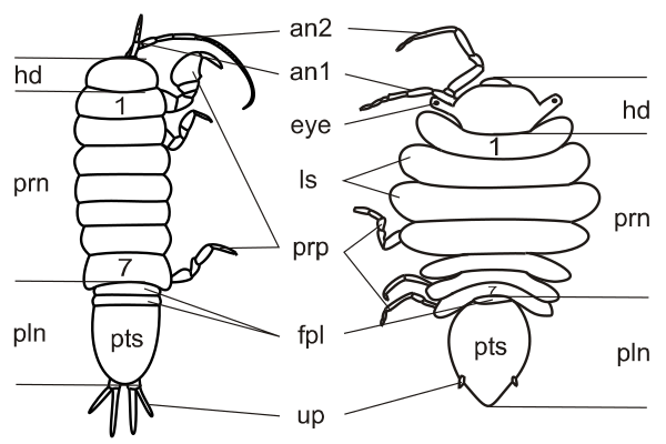 Тагмозис (деление на отделы) тела Asellota соответствует общей схеме строения изопод[3]. Переон обычно имеет полный состав сегментов (переонитов). Однако первый переональный сегмент в нескольких родах сливается с головой, но его конечности при этом не преобразуются во вторые ногочелюсти[9][10]. Кроме того, известны случаи частичной редукции последнего переонита[11][12]. От основной части переона в каждом сегменте у многих Asellota отходят выросты, несущие переоподы.
