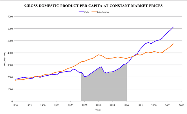 Итоги первого этапа внедрения неолиберальной модели открытой рыночной экономики в Чили, помимо перечисленных достижений, в целом нельзя признать успешными. Среднегодовые темпы прироста ВВП Чили за 17 лет диктатуры были ниже среднего — 1,6 %, в то время как за последующие 17 лет демократии — 4,4 %. «Шоковая терапия» лишь позволила экономике восстановиться после обвала на 13 % в 1975 году. Рост ВВП не сопровождался структурной трансформацией экономики и созданием новых высокотехнологичных отраслей.[5]. Негативными последствиями реформ были[6][7]: