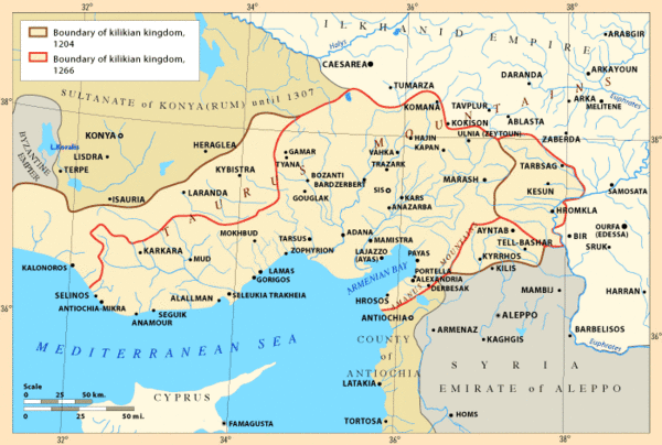 Киликийское армянское государство было основано в Средние века армянами, бежавшими от византийцев, а затем от турок-сельджуков. Киликийские армяне, будучи христианами, во время Первого крестового похода иногда вступали в союз с франкскими крестоносцами.[9] В контексте дружественных армяно-крестоносных отношений они переняли европейские традиции, даже в своих военных одеяниях и стратегиях.