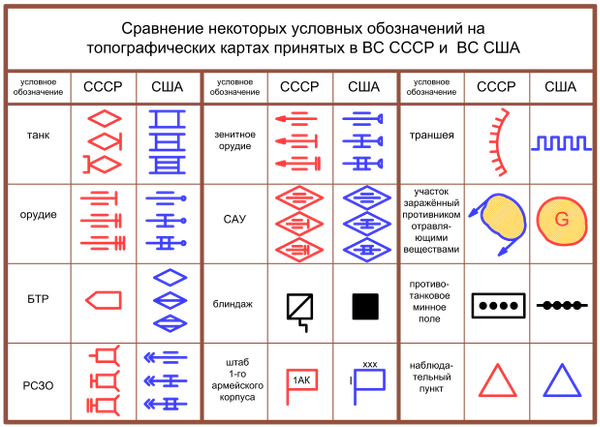 В государствах, являвшихся стратегическими противниками (СССР и США), условное обозначение на картах своих войск и войск противника является противоположным.