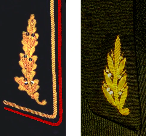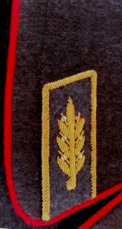 - Для генералов — на воротнике кителя золотое шитьё в виде лавровых листьев (как на открытых кителях), вдоль воротника — двойной золотой сутажный кант, на обшлага — канты и шитьё установленного образца. Парадно-выходной мундир — серого цвета аналогичного покроя и шитья, но без сутажных кантов на воротнике и обшлагах.