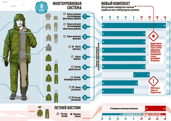 В полевой форме новизна свелась, в основном, к следующему. По словам представителя Минобороны России, новый комплект обычной полевой формы военнослужащих включает в себя 19 предметов одежды, стоимость одного такого комплекта на сегодняшний день составляет порядка 35 000 рублей, при этом бойцам спецподразделений полагается расширенный комплект экипировки.