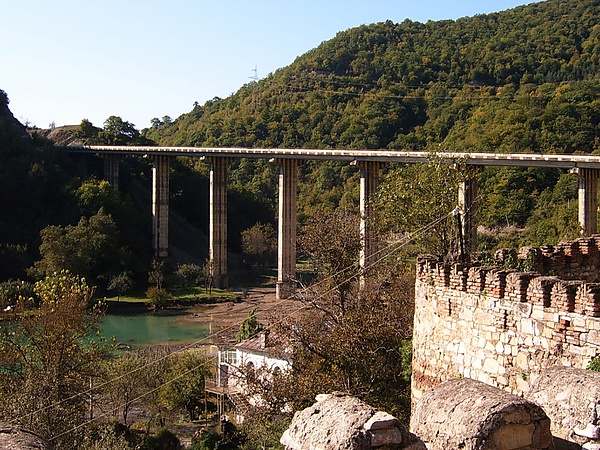 - Гудаурская пропасть и самое высокогорное на Военно-Грузинской дороге селение Гудаури, за которым дорога по извилистому Земомлетскому спуску[13] (инженер Б. Статковский) довольно круто (на 250 м по вертикали) спускается в ущелье реки Арагви. Спуск состоит из 6 ярусов, вырубленных в лавовых породах, и представляет собой замечательный образец инженерного искусства середины XIX века. Этот участок был открыт для движения лишь в 1861 году. Ранее дорога проходила по Квешети-Кайшаурскому направлению.