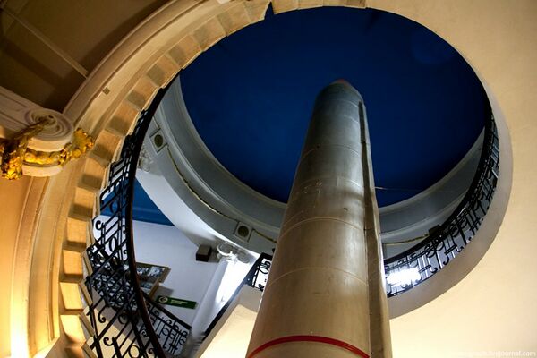 Этажи соединяет винтовая лестница, по центру которой установлен макет баллистической ракеты Р-11 класса «земля-земля», принятой на вооружение в 1958 году[7][8].