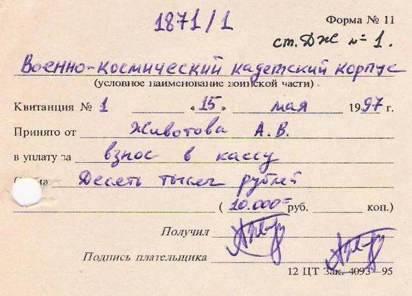 15 мая 1997 года прошла операция № 1 по Денежному журналу (Форма № 41), заработала финансовая служба кадетского корпуса, как отдельное финансовое хозяйство в составе Военно-космических сил (первое руководство: 1-й начальник ВКПВКК полковник Мезенцев Александр Фёдорович и 1-й помощник начальника ВКПВКК по финансово-экономической работе — начальник финансовой службы (Главный бухгалтер) старший лейтенант Животов, Андрей Вадимович).