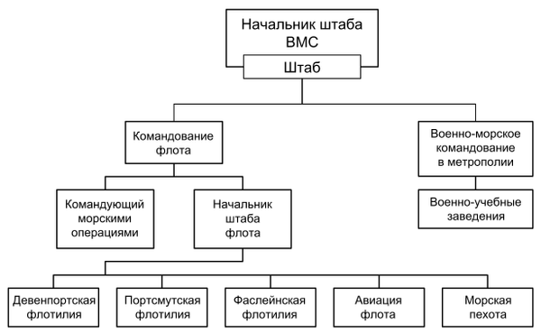 Командование военно-морскими службами осуществляет Первый морской лорд, как председатель Военно-морского комитета (аналог главного штаба ВМС). Совет обороны делегирует руководство Военно-морских сил в Адмиралтейский комитет Великобритании, главой которого является министр обороны Великобритании[48].