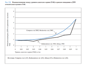 - ↑ Предупреждение дорожно-транспортного травматизма: перспективы здравоохранения в Европе Архивная копия от 24 мая 2011 на Wayback Machine // Всемирная организация здравоохранения, 2004, стр 47 «Рис. 5.2. Взаимоотношение между уровнем алкоголя в крови (УАК) и риском попадания в ДТП относительно нулевого УАК». Исходные данные: