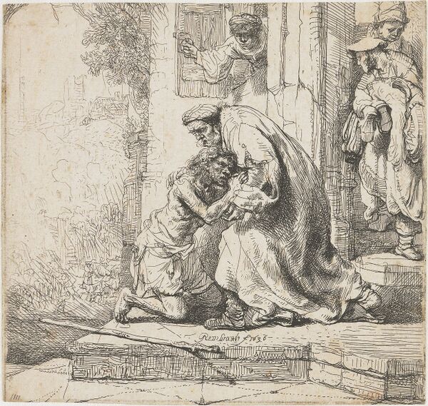 Сотрудник Эрмитажа Ирина Линник считает, что полотно Рембрандта имеет прообраз в гравюре на дереве Корнелиса Антониссена (1541 год), на котором коленопреклоненный сын с отцом также изображены в окружении фигур. Но на гравюре эти фигуры надписаны — Вера, Надежда, Любовь, Покаяние и Правда. В небесах на гравюре на греческом, иврите и латыни написано «Бог». Рентген эрмитажного полотна показал первоначальное сходство картины Рембрандта с деталями упомянутой гравюры. Тем не менее, прямую аналогию провести нельзя — на картине есть только отдалённое сходство с одной из аллегорий Антониссена (самая дальняя и почти исчезающая в темноте), которая напоминает аллегорию Любви, и, вдобавок, имеет красный медальон в форме сердца. Возможно, это изображение матери блудного сына.