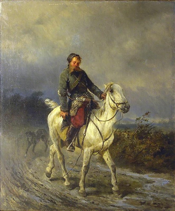 На картине представлен типичный для бытового жанра мотив: пьяный охотник едет верхом на белом коне по загородной дороге. Охотник изображён в момент неустойчивого равновесия — его голова слегка опущена, рот приоткрыт, лицо с длинными рыжими усами и бакенбардами заметно покраснело. Левой рукой он держится за гриву лошади, правая рука свободно свисает, правая нога находится в стремени. Одет в тёмно-серый кафтан на меху, бордовые шаровары, сапоги и небольшую тёмную шапку; через плечо перекинуты ремни, на поясе виден кинжал. Узда лошади волочится по земле, за конём следует чёрная собака.