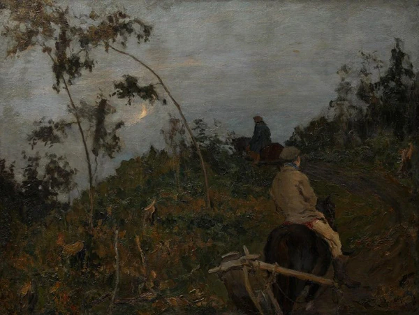 Картина относится к жанру пейзажа. На переднем плане справа изображён подросток верхом на лошади, обращённый спиной к зрителю. Вдоль дороги вдалеке виден силуэт женщины на лошади. Слева расположен крутой спуск, поросший кустарником и травой. Линия горизонта проведена по диагонали от нижнего левого угла к верхнему правому. В серо-голубом небе слева виден край луны.