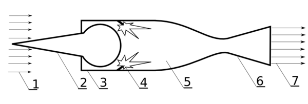 Конструктивно ПВРД имеет предельно простое устройство. Двигатель состоит из камеры сгорания, в которую из диффузора поступает воздух, а из топливных форсунок — горючее. Заканчивается камера сгорания входом в сопло, как правило, суживающееся-расширяющееся.