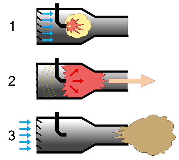 - Топливная смесь воспламеняется и сгорает, давление в камере сгорания резко возрастает и закрывает воздушный клапан и обратный клапан в топливном тракте. Продукты сгорания, расширяясь, истекают из сопла, создавая реактивную тягу.