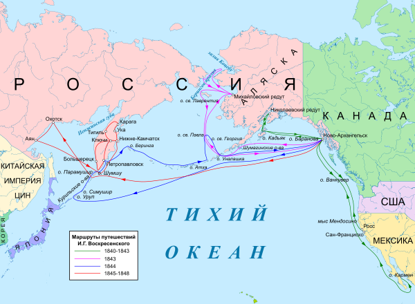 Командировка в Русскую Америку имела несколько целей. От учёных Академии наук он получил подробные инструкции по сбору коллекций: ботанических (Ф. Е. Фишер и Г. П. Бонгард), этнографических (Е. И. Шрадер) и зоологических (Ф. Ф. Брандт)[7]. 20 августа 1839 года Вознесенский вышел в море на транспортном корабле Российско-Американской компании «Николай I» из Кронштадта[8].