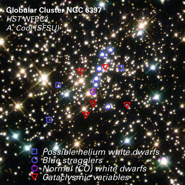 В галактиках шаровые скопления, входящие в старую сферическую подсистему галактик, содержат множество белых карликов — остатков проэволюционировавших красных гигантов относительно небольшой массы. Белые карлики лишены собственных источников термоядерной энергии и излучают исключительно за счёт излучения запасов тепла. Белые карлики имеют приблизительно одинаковую массу звёзд-предшественниц, а значит — и приблизительно одинаковую зависимость температуры от времени. Определив по спектру белого карлика его абсолютную звёздную величину на данный момент и зная зависимость время-светимость при остывании, можно определить возраст карлика[9].