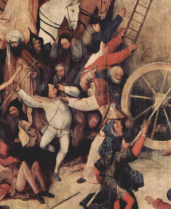 Путь босховского пилигрима пролегает через враждебный и коварный мир, а все опасности, которые он таит, представлены в деталях пейзажа. Одни угрожают жизни, воплощаясь в образах разбойников или злобной собаки (впрочем, она может символизировать также и клеветников, чьё злоязычие часто сравнивали с собачьим лаем). Пляшущие крестьяне — образ иной, моральной опасности; подобно любовникам на верху воза с сеном, они прельстились «музыкой плоти» и покорились ей. Босховский персонаж приводит на память «Обывателя» (в голландской литературе — Elckerlijk, в немецкой — Jedermann), чьё духовное паломничество служило темой для многочисленных нравоучительных пьес того времени.