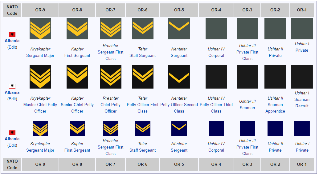 | Албанское звание | Kryekapter | Kapter | Rreshter | Tetar | Nëntetar | Ushtar IV | Ushtar III | Ushtar II | Ushtar I |