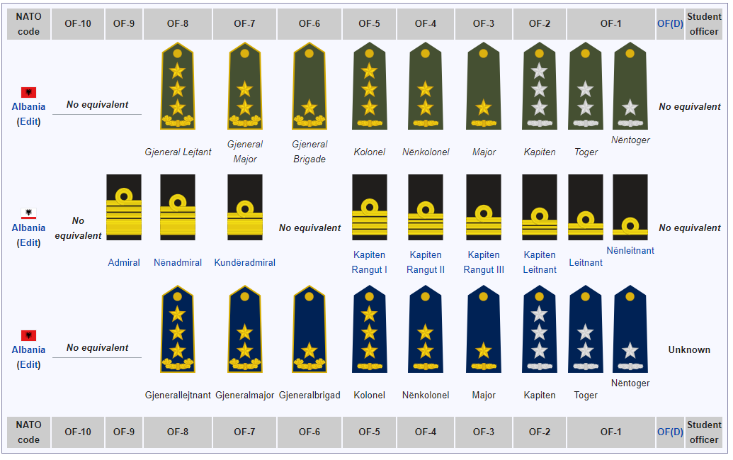 | Албанское звание | Gjeneral | Gjeneral Lejtnant | Gjeneral Major | Gjeneral Brigade | Kolonel | Nënkolonel | Major | Kapiten | Toger | Nëntoger |