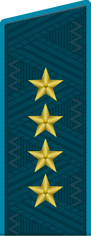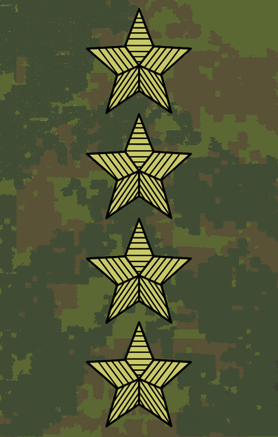 - Генерал армии, адмирал флота — одна большая вышитая звезда диаметром 40 мм (с 22 февраля 2013 года)[11]; над ней расположена вышитая звезда, обрамлённая венком (цвет звезды соответствует роду службы, диаметр венка 35 мм)[10].