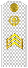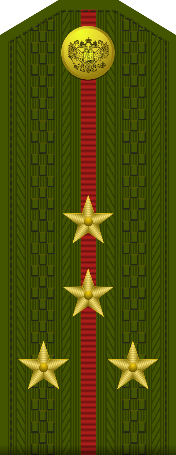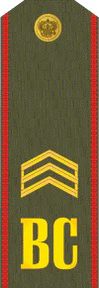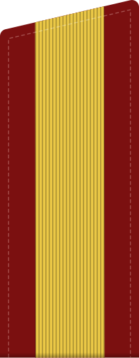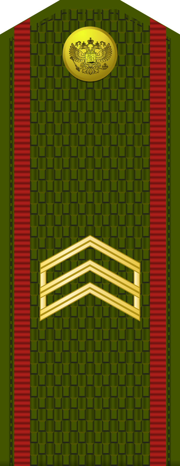 | Войсковые звания | Рядовой | Ефрейтор | Младший сержант | Сержант | Старший сержант | Старшина | Прапорщик | Старший прапорщик | Младший лейтенант | Лейтенант | Ст. лейтенант | Капитан | Майор | Подполковник | Полковник | Генерал-майор | Генерал-лейтенант | Генерал-полковник | Генерал армии (до 2013) | Генерал армии[12] | Маршал Российской Федерации |