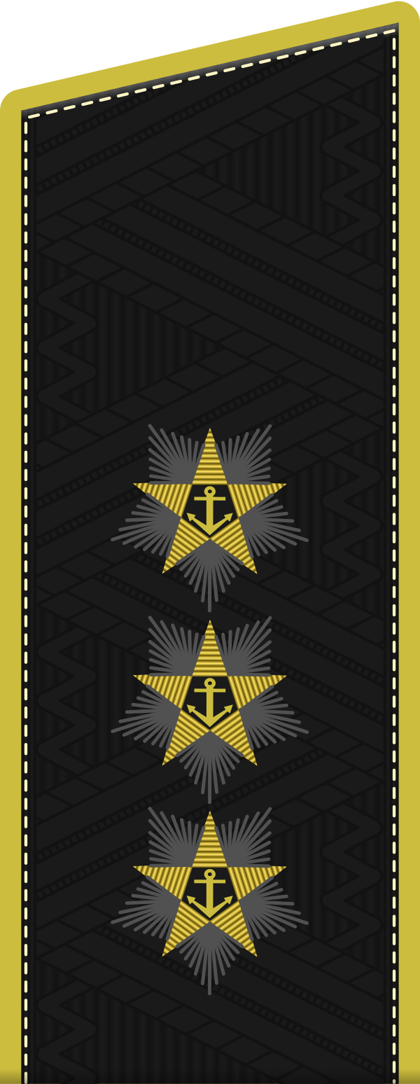 - Повседневный китель, зимнее пальто — нашивные четырёхугольные погоны чёрного цвета, у адмиралов с окантовкой по бокам жёлтого цвета.