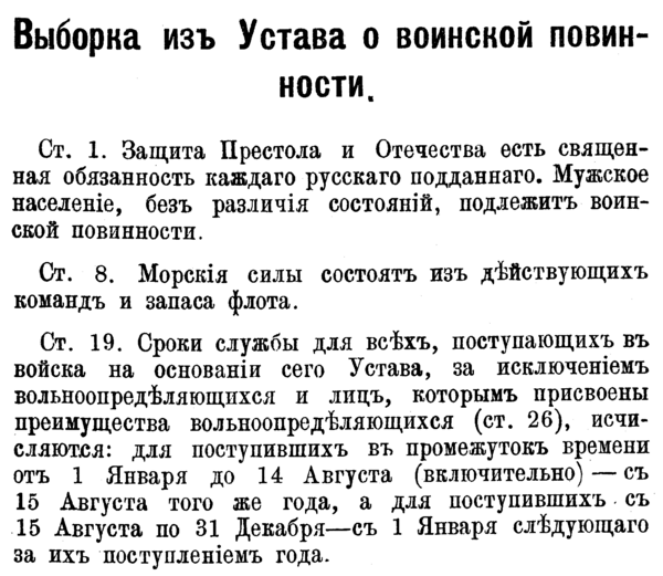 В XVIII — начале XX веках в русской армии воинские уставы издавались неоднократно. Воинский устав, например, 1804 года, структурно подразделялся на три части: собственно Устав, Артикул воинский и Экзерциции. Первая часть формулировала армейскую структуру и функциональные задачи должностных лиц. Артикул регламентировал нормы поведения военнослужащих в совершенно конкретных случаях, с комментариями. Экзерциции являли собой упражнения с оружием. Устав и Артикул, написанные в обобщающих формулировках, не имели чётких, кратких и недвусмысленных толкований норм морали, поведения и воинской чести. Наказания имели крайне ограниченный выбор: либо смерть, либо пожизненная каторга или галеры. Уставы той эпохи включали в себя общевоинский, строевой, дисциплинарный, а также гарнизонной и караульной службы одновременно. Например, Артикул 177 (Устава 1804 года) призывал: «от позорных и блядских песней достойно и надобно под наказанием удержаться…» (конкретного наказания не указано)[4]. Артикул 167 в своей основе содержал гражданское уголовное начало: «Ежели кто женский пол, старую или молодую, замужнюю или холостую, в неприятельской или дружеской земле изнасильствует, оному голову отсечь или вечно на галеру послать по силе дела». Совершенно очевидно, что воинский устав начала XIX века имел зачатки современного международного гуманитарного права. Развитие военной науки потребовало в дальнейшем оформления «Устава», «Артикула» и «Экзерциции» в отдельные нормативно-правовые акты: боевой устав видов вооружённых сил, устав гарнизонной и караульной службы, общевоинский устав, различные наставления, дисциплинарный устав. Следует отметить, что последний, где были чётко и кратко сформулированы сущностные задачи воинской дисциплины, как таковой появился в 1840-х годах, и можно с большой вероятностью утверждать, что впервые в европейской военной науке сущностные задачи, цели и методы достижения воинской дисциплины были обозначены полковником квартирмейстерской части А. И. Хатовым[4] в рукописи «О воинской дисциплине», преподнесённой императору Александру I и хранящейся ныне в отделе рукописей Российской Государственной библиотеки.