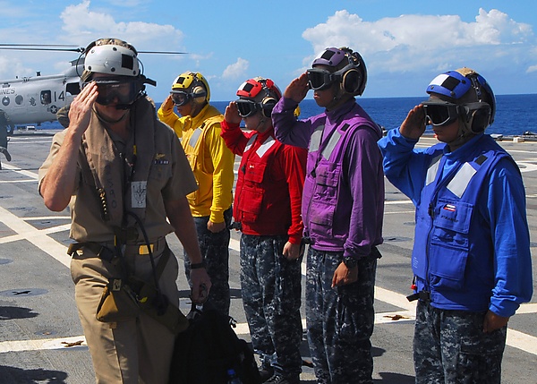 - Государственному флагу Российской Федерации, Боевому знамени воинской части, а также Военно-морскому флагу при каждом прибытии на корабль и убытии с корабля;