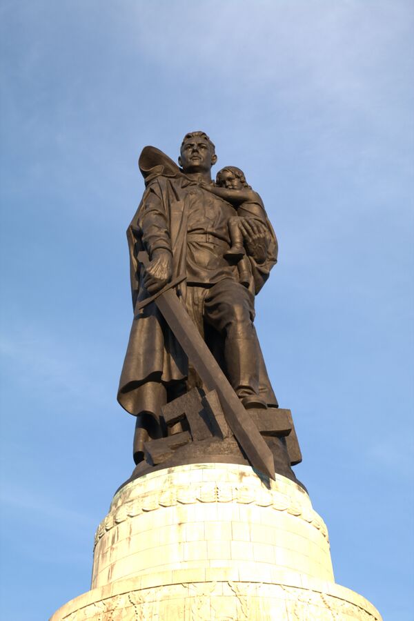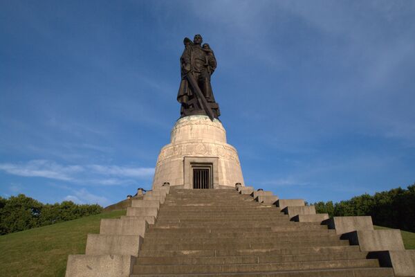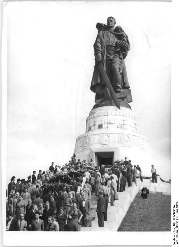 Мемориальный комплекс в Трептов-парке был создан после конкурса, в котором принимало участие 33 проекта. Победил проект Е. В. Вучетича и Я. Б. Белопольского. Строительство комплекса осуществлялось под руководством «27-го управления оборонных сооружений» советской армии. В работах было задействовано около 1200 немецких рабочих, а также немецкие фирмы — литейная мастерская Noack, мастерские по мозаике и витражам Puhl & Wagner, садовые товарищества Шпэта (нем. Baumschule Späth). Скульптура солдата массой около 70 тонн была изготовлена весной 1949 года на ленинградском заводе «Монументальная скульптура» в виде шести частей, которые были отправлены в Берлин. Работы по созданию мемориала были завершены в мае 1949 года. 8 мая 1949 года мемориал был торжественно открыт советским комендантом Берлина генерал-майором А. Г. Котиковым. В сентябре 1949 года обязанности по уходу и содержанию памятника были переданы советской военной комендатурой магистрату Большого Берлина.