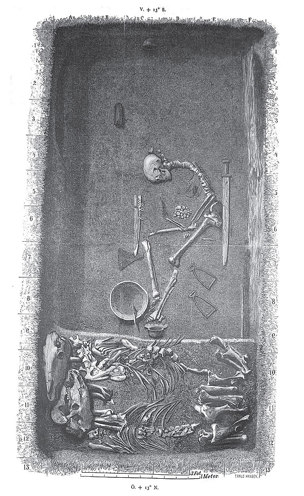 Археолог и этнограф Яльмар Стольпе (1841—1905) в 1870-х годах в рамках археологических исследований на острове Бьёркё раскопал погребальную камеру в Бирке, поселении эпохи викингов (VIII–X век н. э.). В 1889 году он задокументировал могилу под обозначением Bj 581[1][2]. Она считается «одной из самых знаковых могил эпохи викингов»[3]. Могила была обозначена большим каменным валуном и была найдена на возвышенной террасе, где она непосредственно контактировала с гарнизоном[4]. Погребальная камера была деревянной, ее длина — 3,45 метра, ширина — 1,75 метра. Тело было найдено в сидячем положении, в одежде из шелка и серебряных нитей[5]. В могиле нашли «меч, топор, копье, бронебойные стрелы, боевой нож, два щита и две лошади: одну кобылу и одного жеребца»[4]. В течение следующих 128 лет предполагалось, что скелет принадлежит «закаленному бойцу»[6]. Предполагаемого воина сравнивали с «фигурой из „Полёта валькирий“ Рихарда Вагнера»[7].