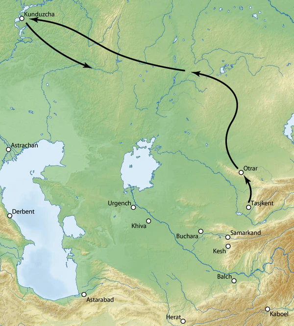 Весной 1395 года Тимур устроил смотр своему войску возле Каспийского моря. Как сообщает Язди, авангард левого фланга Тимура стоял у подножия гор Эльбурса, а правый фланг — на берегах Каспийского моря. Обогнув Каспий, Тимур пошёл сначала на запад, а потом по широкой дуге повернул на север. Армия прошла через Дербентский проход, пересекла Грузию и вышла на территорию Большой Чечни, государства Симсим, союзника Тохтамыша. Здесь, в гористой местности, Тохтамыш не мог вынудить Тимура вести утомительную многомесячную погоню, и 15 апреля 1395 года две армии сошлись на берегах реки Терек. В последовавшем сражении армия Золотой Орды была уничтожена, и страна оказалась беззащитной. Чтобы Тохтамыш не восстановился вновь, армия Тимура отправилась на север к берегам Итиля и отогнала Тохтамыша в леса Булгара. Затем войско Тамерлана двинулось на запад к Днепру, потом поднялось на север и разорило Елец, а затем спустилось на Дон, откуда через Кавказ вернулось на родину.