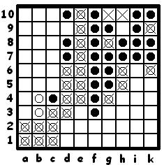 - Аналогично определяются клетки, доступные для ноликов: либо непосредственно соприкасающиеся с одним из ноликов, либо через цепочку убитых крестиков.