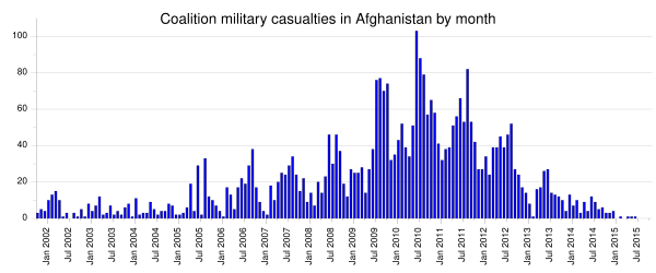 Согласно данным министерств обороны США и Великобритании, а также независимого интернет-сайта iCasualties.org, до 31 декабря 2014 года боевые и небоевые потери международной коалиции в ходе операции «Несокрушимая свобода» (главным образом в Афганистане) составили свыше 3 485 военнослужащих погибшими. Наибольшие потери понесли США (2 356), Великобритания (453), Канада (162[419]), Франция (88[420]), ФРГ (55[421]).