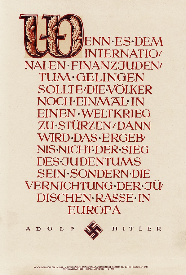 Исторический субъект под названием «международное еврейство» развязал Вторую мировую войну с намерением вызвать «большевизацию» мира. Это потерпит неудачу. Вместо этого нацистская Германия отомстит за эту агрессию и уничтожит евреев. Она будет вести «войну» против евреев в ответ на «войну», которую евреи начали.