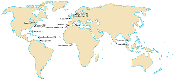 - все морские операции в ходе войны, включавшие Великобританию, Францию, Испанию, Нидерланды и их колонии, как в американских водах, так и по всему миру.