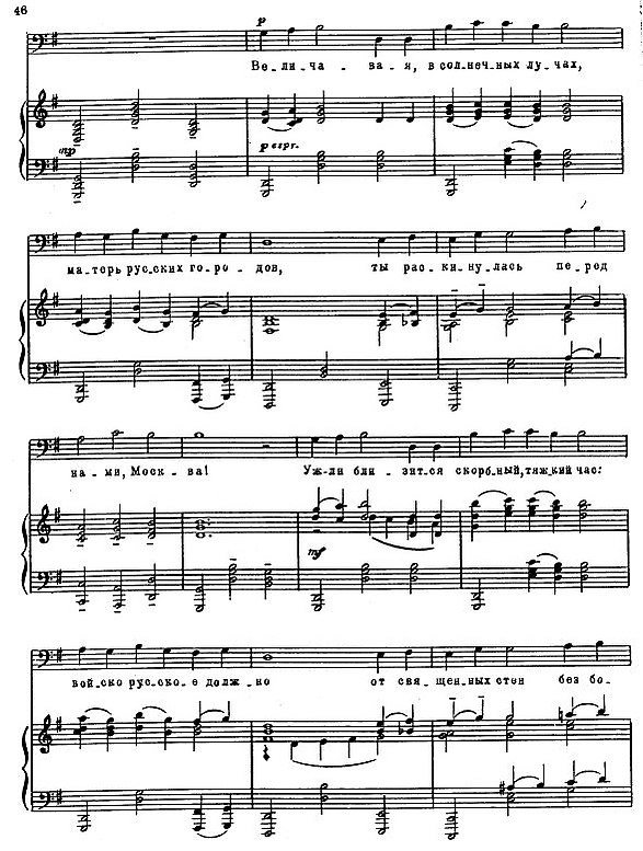 Мы знакомились с литературой о 1812 годе, о фельдмаршале Кутузове. Читали Тарле, путеводитель по местам боев Бородинского сражения, сборники русских народных песен, пословиц, поговорок того времени, записки поэта-партизана Дениса Давыдова (откуда использовали текст для арий Денисова и частично для эпиграфа). В сборнике „Изгнание Наполеона из Москвы” мы нашли подходящий текст для хоровых эпизодов в картинах „Перед Бородинским сражением” и „Москва” (средняя часть хора в начале картины — „Чу!., и к нам уж налетела иноземна саранча” и хор солдат „По-старинному, по-суворовски” — в картине „Перед Бородинским сражением”; хор жителей Москвы „В ночку темную и немесячну” в финале картины „Москва”). Иногда приходилось писать текст уже после того, как Сергеем Сергеевичем была написана музыка. В таких случаях он давал мне определенные размеры, соответственно которым должны были быть написаны стихотворные тексты (на основе текстов народных песен)» (36, с. ).[10]