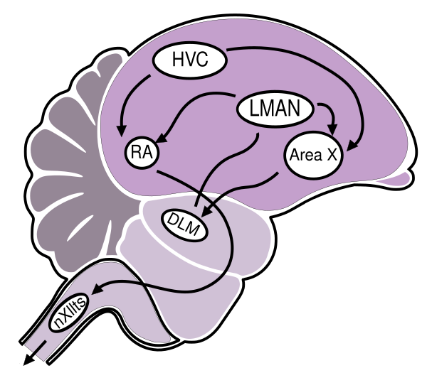 - Передняя часть переднего мозга, который отвечает за обучение: состоит из латеральной части магноцеллюлярного ядра переднего нового полосатого тела (lateral part of the magnocellular nucleus of anterіor neostrіatum, LMAN, гомолога базальных ганглиев млекопитающих), области X (части базальных ганглиев) и дорсально-латерального отдела среднего таламуса (DLM).