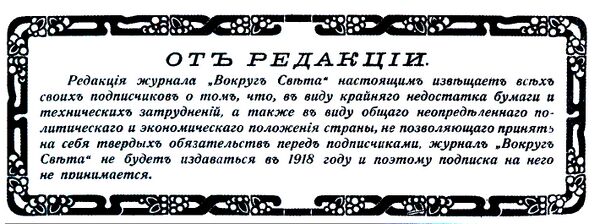 1917-й стал последним годом в дореволюционной истории «Вокруг света». После Октябрьской социалистической революции И. Д. Сытин был вынужден прекратить выпуск журнала. В 45-м номере от 12 ноября 1917 г. появилось сообщение редакции, где говорилось, что в 1918 году журнал издаваться не будет — из-за дефицита бумаги и общей неопределённости жизни, затрудняющих исполнение обязательств перед подписчиками[7].