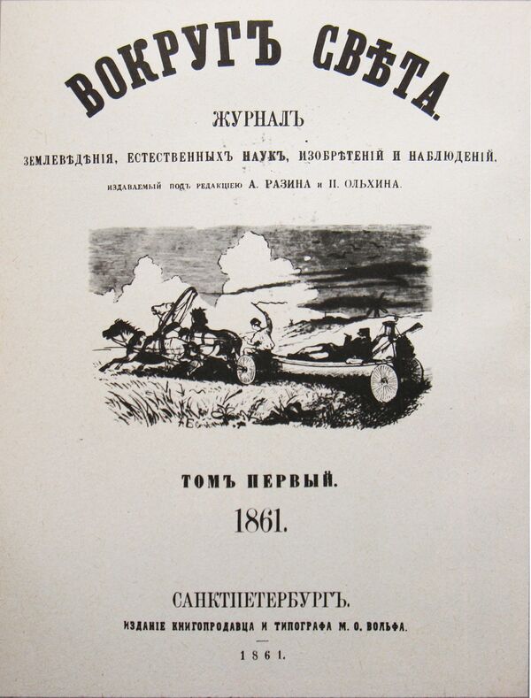 На первом этапе «Вокруг света» имел подзаголовок «Журнал землеведения, естественных наук, новейших открытий, изобретений и наблюдений», говоривший о тематических предпочтениях редакции. При этом преобладали материалы на географические темы — статьи о дальних странах, их экзотической природе, обычаях иноземных народов. В XIX веке продолжалась эпоха географических открытий, изучения животного и растительного мира. Очерки путешественников, исследователей и учёных со всего мира переводились и публиковались в журнале. Материалы доставляли в редакцию по заключённым договорам М. О. Вольфа с заграничными издателями. Переводом и редактированием текстов занимался П. М. Ольхин, он же выбирал наиболее интересные, кроме того, использовал компиляцию, дополнял текст заметками из других источников. В результате русский читатель видел полную картину о мире, знал о новых, только что произошедших открытиях. Журнал не обходил стороной и материалы отечественных путешественников о народах Азии, о землях Сибири, городах Поволжья и т. д. Журнал печатался на качественной бумаге в виде объёмных томов и содержал в себе множество рисунков и гравюр к текстам. При этом цена журнала была доступной для массового читателя[8].