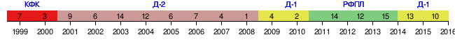 | Сезон | Дивизион | И | В | Н | П | М | О | Место | Бомбардиры |