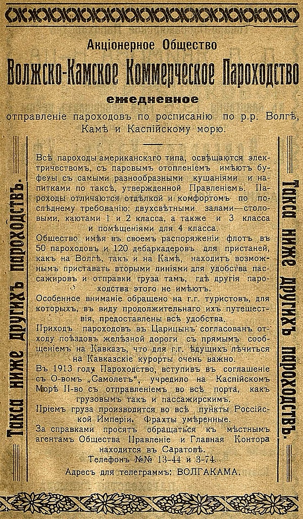 В 1914 году компания была преобразована в акционерное общество с основным капиталом в 3 миллиона рублей (30 тысяч акций по 100 рублей[2]). В его правление входили — П. М. Репнин (председатель), В. А. Дашковский, М. И. и П. И. Телятниковы, А. И. Исаев. Главное управление пароходства находилось в Саратове.[3]
