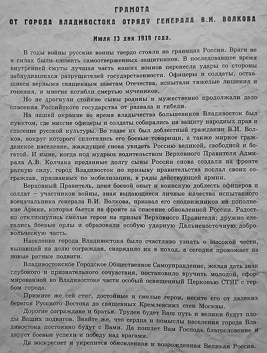 В. И. Волков: «Решительные меры горячо приветствую, но для проведения их в жизнь необходимо объединить войска и тыловой район, включая Иркутск, Читу, Красноярск, в одних руках, именование „временно“ не считаю полезным, как все половинчатое. Необходимо обеспечить тыл востока, то есть район 4 корпуса, где не все в порядке, под давлением социалистов-революционеров здесь были арестованы командиры, полковник Зелов, до сих пор состоящий под арестом, по странным поводам, например, капитан Рудаков арестован за расстрел по военному суду агитатора, комкор слабый, дружит с левыми группами, желательна замена комкора, его помощника генерала Никитина и инаркора полковника Петухова, комиссар Яковлев левый, желательна его замена Якимовым, Иван Адрианович его знает и предполагал заменить. Есть временный кандидат генерал Тарнопольский, ныне начальник артиллерии округа, помощник комкора не нужен совсем, наштакор полковник Тонких на месте, (на пост) инаркора (предлагаю) полковника Лабунцова, который завтра, вероятно, будет в Омске у Вас с докладом, узнать о нём можно у капитана Симонова, начразотдела».