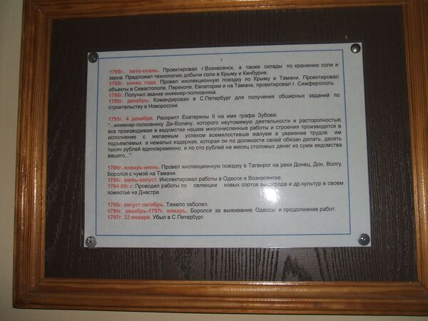 В звании старшего инженера в 1795 году он управлял постройкой крепости Фанагории, порта Ахтиар, крепостей Кинбурнской и Тираспольской, а также руководил основанием Перекопа, Овидиополя, Григориополя, Вознесенска и составлял планы большей части вновь строившихся тогда в России городов (Николаева, Новочеркасска, Каменска-Шахтинского и других).