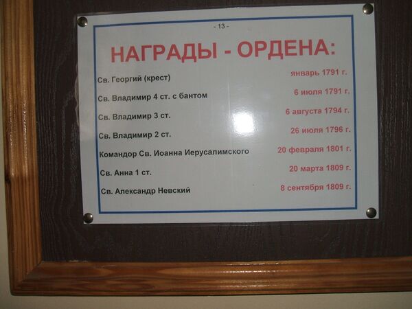 | Награды и премии | Орден Святого Георгия 4-й ст. (1791), Орден Святого Владимира 4-й ст. (1791), Орден Святого Владимира 3-й ст. (1794), Орден Святого Владимира 2-й ст. (1796), св. Иоанна Иерусалимского (1801), Орден Святой Анны 1-й ст. (1802), Орден Святого Александра Невского (1809) |