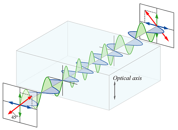 В зависимости от толщины кристалла свет с поляризационными компонентами вдоль разных осей выйдет из него в разных состояниях. Волновую пластинку характеризуют разностью фаз Γ между двумя компонентами, определяемой параметром Δn двойного лучепреломления и толщиной кристалла L по формуле