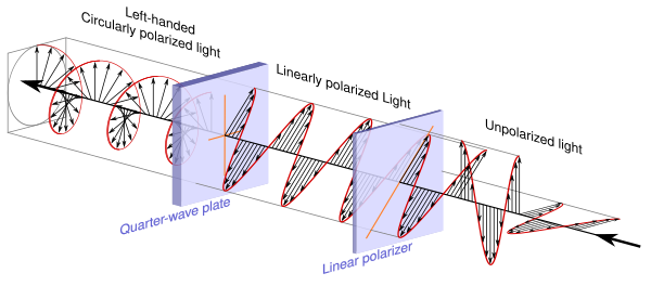 где оси f и s являются соответственно быстрой и медленной осями пластинки, а волна распространяется вдоль оси z. Ef и Es — вещественны. Четвертьволновая пластинка приводит к фазовому множителю eiΓ = eiπ/2 = i между f и s компонентами волны, так что на выходе из кристалла волна имеет вид