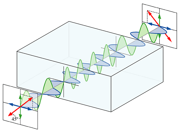 Если вектор поляризации волны, падающей на кристалл, выбран так, что образует угол 45° с быстрой и медленной осями пластинки, то Ef = Es ≡ E, и исходная волна имеет вид