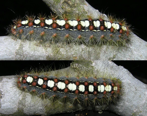 Взрослые гусеницы длиной около 40 мм. Туловище чёрного цвета, по бокам и с брюшной стороны желтовато-серого цвета, с 4 рядами буровато-красных бородавок, усаженных кучками длинных буровато-жёлтых волосков. Между этими бородавками находятся небольшие конусообразные возвышения, которые могут немного выпячиваться и из которых при раздражении выступает капля жидкости — секрет кожных желез, находящихся внутри упомянутых возвышений (секрет железы, вероятно, служит для защиты от врагов). На спинной стороне тела находится ряд белых или желтовато-белых продолговатых пятен. Гусеницы сильно объедают листья ив и тополей (едят преимущественно ночью, а днём сидят спокойно на листьях и стволах). Перед окукливанием скрепляют отдельными паутинными нитями несколько листьев. Куколки чёрные с многочисленными мелкими беловатыми пятнышками и жёлтыми волосками.