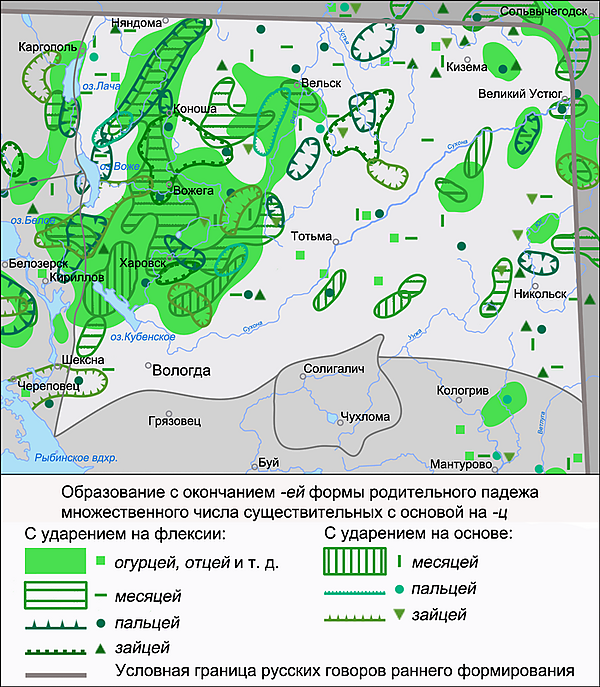 - Образование форм родительного падежа множественного числа с окончанием -ей от существительных, основа которых оканчивается на -ц- типа пал’це́й, огурце́й, встречающееся в широком круге слов: коло́дец, та́нец, новобра́нец, молоде́ц, си́тец, украи́нец, гости́нец, ва́ленец «валенок», кузне́ц, коне́ц, оте́ц, бегле́ц, жиле́ц, лове́ц, жеребе́ц, шве́ц, скворе́ц, слепе́ц, за́яц, ме́сяц и т. п. Наиболее часто употребляются формы с окончанием -ей от существительных с ударением на окончании и от слов па́лец, за́яц, ме́сяц. У существительных с ударением на окончании в форме родительного падежа ударение также падает на окончание (огурце́й, купце́й, отце́й и т. п.), у существительных с ударением на основе в форме родительного падежа окончание может быть как ударным, так и безударным (па́л’цей, за́йцей или пал’це́й, зайце́й и т. п.). В ряде говоров окончание -ей для форм родительного падежа может быть у подобных существительных исключительным. Данное явление известно преимущественно в западной и северной частях, в рассеянном распространении встречается в восточной части и почти полностью отсутствует в центральной и южной частях территории распространения говоров Вологодской группы[98]. Более последовательно без каких-либо ограничений лексического плана формы родительного падежа множественного числа с окончанием -ей распространены в межзональных говорах северного наречия[99]. Формы па́л’цей, за́йцей нерегулярно распространены в говорах Владимирско-Поволжской группы[100], широко распространена форма огурце́й в отделе Б восточных среднерусских акающих говоров, менее широко — формы купце́й, отце́й, танце́й и т. п.[101]