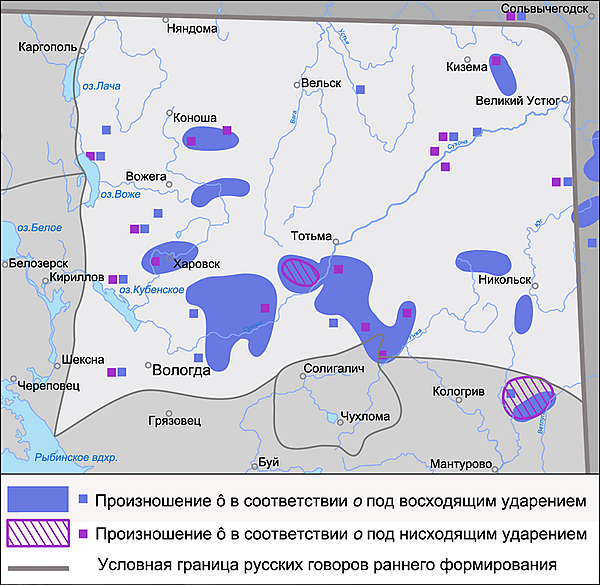 Сохранение случаев произношения /о̂/ ([о̂], [у], [оу], [уо], [у͡о], [уо])[~ 3][58] отмечается в основном в западной и южной частях территории Вологодской группы. В соответствии о под восходящим ударением /о̂/ произносится в корнях слов (вор[о̂́]на, к[о̂́]зы, в[о̂́]л’а, выс[о̂́]кий, сн[о̂]п, г[у͡о]рки, мн[о̂́]го, к[о̂́]шка, на л[у͡о]дках, ст[о̂]л и т. д.); в окончании именительного — винительного падежей единственного числа существительных среднего рода (сел[о̂́], окн[о̂́], помел[у͡о] т. д.); в окончании именительного падежа единственного числа кратких прилагательных и образованных от них наречий (давн[о̂́], смешн[о̂́] и т. д.); в окончании глаголов прошедшего времени (наросл[у͡о], прошл[о̂́] и т. д.); в окончании -ов существительных мужского рода в форме родительного падежа множественного числа (год[о̂́]в, двор[о̂́]в, дом[о̂́]в и т. д.); в окончании родительного падежа единственного числа мужского и среднего рода прилагательных (друг[о̂́]го, шест[о̂́]го и т. д.); в окончании родительного, дательного, творительного и предложного падежей прилагательных женского рода (у зл[о̂́]й, к бол’н[о̂́]й, бол’н[о̂́]й ного̂́й, в родн[о̂́]й и т. д.); в окончании существительных женского рода в форме творительного падежа единственного числа (стен[о̂́]й, за вод[о̂́]й и т. д.)[64].