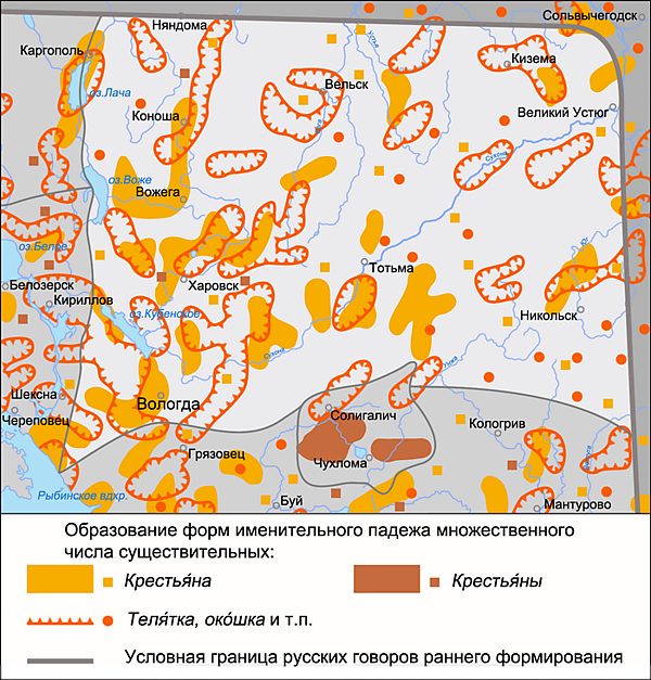 - Наличие словоформы именительного падежа множественного числа крест’а́н[а]. Данная словоформа чаще всего распространена в западной и центральной частях ареала Вологодской группы наряду со словоформой крест’а́н[е] и единичными случаями словоформы крест’а́н[ы]. На территории северного наречия встречаются также подобные формы (не картографированные при составлении ДАРЯ): горожа́н[а], меща́н[а] и т. п.